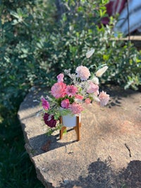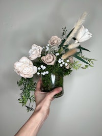 Handmade in San Andreas, CA, this stunning, artificial bouquet is full of hand dyed wood flowers, preserved forest moss, and a mixture of real looking green spruces.
