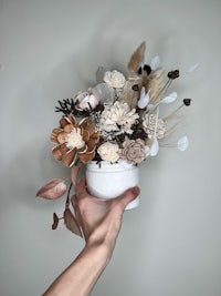 Flowers are made from a soft foam-like wood and individually hand dyed. Made from a fast growing plant, the flowers are sustainable and eco friendly. They never wilt or die making them perfect for gifts or low maintenance home decor.