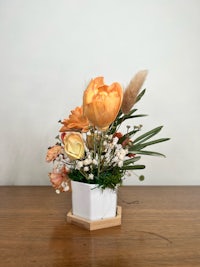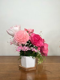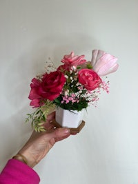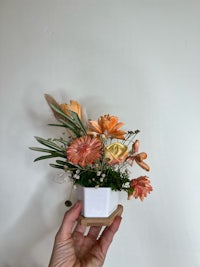 We are excited to share our adorable small potted arrangement! It is perfect for a desk, a windowsill, a ledge, or bathroom. The arrangement is 360 degrees meaning it looks great from every angle.