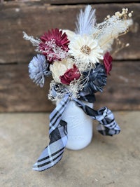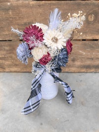 Featuring a white mason jar with 10+ wood flowers, babies breath, and pampas grass.