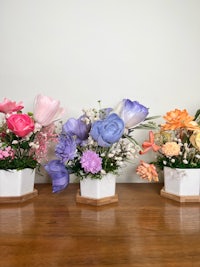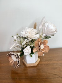 Flowers are made from a soft foam-like wood and individually hand dyed. Made from a fast growing plant, the flowers are sustainable and eco friendly. They never wilt or die making them perfect for gifts or low maintenance home decor.