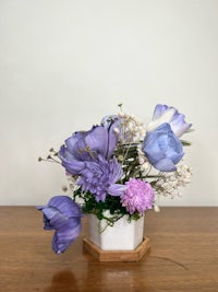 We are excited to share our adorable small potted arrangement! It is perfect for a desk, a windowsill, a ledge, or bathroom. The arrangement is 360 degrees meaning it looks great from every angle.